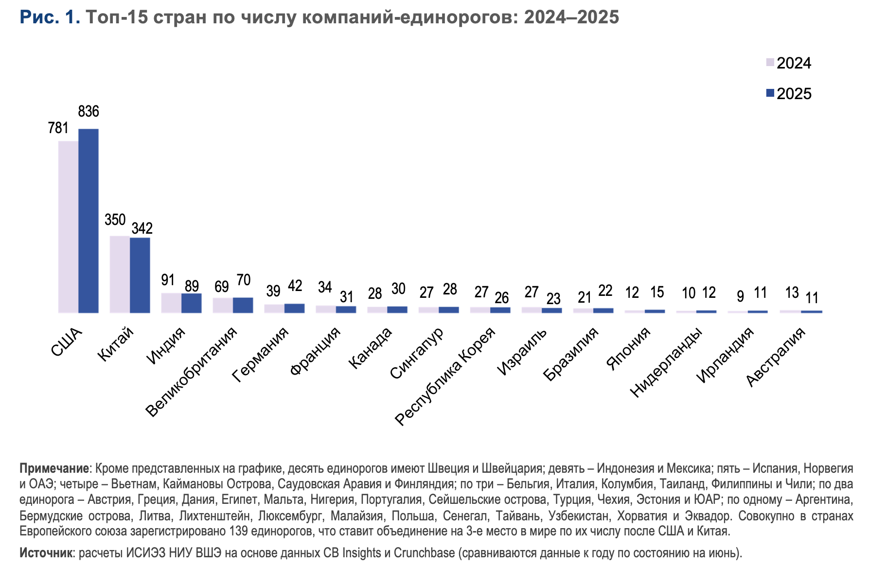 По состоянию на июнь 2025 г. в мире насчитывается 1711 компаний-единорогов. Тренд на замедление прироста миллиардных венчуров сохраняется: в 2025 г. их число увеличилось на 53, что в 2,4 раза меньше, чем в 2024 г. (+127), вчетверо — по сравнению с 2023 г. (+229) и в шесть раз — по отношению к 2022 г. (+340). Впервые с 2021 г. шесть из пятнадцати стран-лидеров, концентрирующих 93% всех компаний-единорогов, продемонстрировали сокращение числа миллиардных венчуров (рис. 1). Среди них — Китай (-8 компаний-единорогов), Израиль (-4), Франция (-3), Австралия и Индия (в каждой по −2), Республика Корея (-1). При этом США остаются мировым лидером по появлению компаний-единорогов (+55).